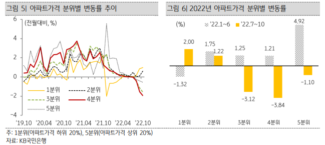 4분위(상위20~40%)가 7월 이후 4개월 연속 하락, 이어서 3분위·5분위 가격도 하락하기 시작 ∙아파트 가격 하락폭이 점차 확대되는 가운데, 3분위와 4분위의 아파트 가격은 올해 상반기 상 승폭에 비해 7~10월 하락폭이 더욱 큰 상황